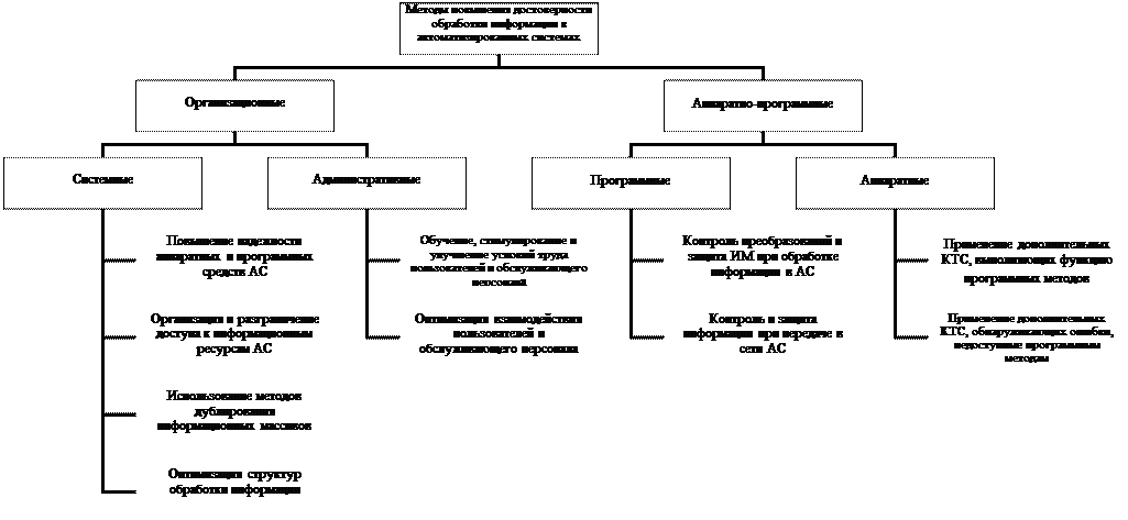 Для программных средств рассматривают два этапа – этап разработки и этап эксплуатации. Этап разработки программных средств является определяющим при создании надежных компьютерных систем. На этапе эксплуатации программные средства дорабатываются, в них устраняются замеченные ошибки, поддерживается целостность программных средств и актуальность данных, используемых этими средствами.[10] Аппаратно-программные методы повышения достоверности перерабатываемой в автоматизированных системах информации представляют собой совокупность методов контроля и выявления ошибок в исходных и получаемых информационных массивах, их локализации и исправления.[11] При эксплуатации автоматизированных систем существует возможность разрушения информационных массивов, которое приводит к появлению ошибок в результатах, невозможности решения некоторых функциональных задач или к полному отказу автоматизированных систем. Основными причинами нарушения целостности и готовности информационных массивов в процессе их непосредственного использования или хранения на носителях являются ошибки и преднамеренные действия операторов и обслуживающего персонала, деструктивные действия компьютерных вирусов, агрессивность внешней среды (температура, влажность и др.), износ носителей информации, приводящие к разрушению информационных массивов или их носителей. Проблема обеспечения целостности и готовности информации при эксплуатации автоматизированных систем заключается в разграничении доступа к информационным массивам и программно-техническим ресурсам, контроле правильности информационных массивов, обнаружении ошибок, резервировании и восстановлении информационных массивов во внутримашинной информационной базе по зарезервированным информационным массивам.[12] Методы повышения сохранности информации в автоматизированных системах в зависимости от вида их реализации можно разделить на организационные и аппаратно-программные. I. Организационные методы повышения сохранности состоят в создании и использовании рациональной технологии эксплуатации информационных массивов, предусматривающей профилактические меры по снижению доли искажений информационных массивов до определенного допустимого уровня и по обеспечению своевременного предоставления необходимых аутентичных информационных массивов для автоматизированного решения задач автоматизированных систем. Основными из них являются: 1) учет и хранение информационных массивов в базах данных автоматизированных систем; 2) контроль за качеством работы операторов и обслуживающего персонала; 3) контроль износа и старения технических средств, функционирования автоматических систем, а также правильности их эксплуатации; 4) профотбор, обучение и стимулирование персонала автоматизированных систем; 5) организация труда персонала автоматизированных систем, обеспечивающая уменьшение возможностей нарушения им требований сохранности информационных массивов; 6) обеспечение противопожарной защиты и температурно-влажностного режима. II. Аппаратно-программными методами повышения сохранности информации являются: 1) резервирование информации (обеспечивает защиту информации как от случайных угроз, так и от преднамеренных воздействий): - оперативное резервирование – создание и хран