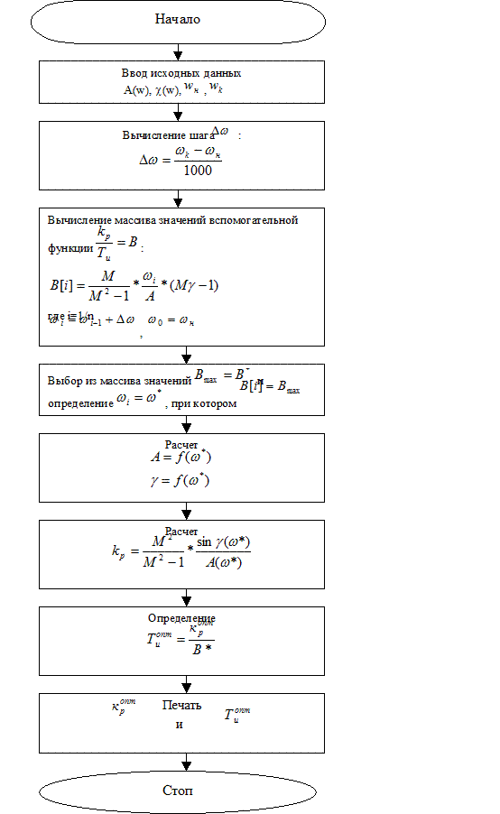 Рис 3.1. Алгоритм расчета оптимальных параметров ПИ-регулятора на ЭВМ.