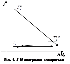 ![]() (T , I обозначаем температуры и энтальпии газов, t , h – воды и пара). В действительности средний температурный напор отличается от среднелогарифмического в некоторое примерно постоянное число раз ψ, но, поскольку нас в данном расчёте интересуют относительные изменения величин, этим можно пренебречь. В испарительную поверхность сначала поступает недогретая вода, затем под напором циркуляционного насоса пароводяная смесь кипит при температуре, большей температуры в барабане (рис. 4). Без значительного роста погрешности можем считать, что