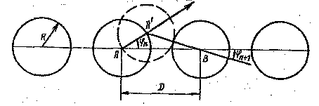 Иногда наличие регулярного расположения атомов в материале мишени приводит к так называемым кооперативным эффектам: · фокусировке · каналированию · блокировке. 1. Фокусировка. Из геометрических соображений можно получить соотношение между последовательными начальными углами направления движения налетающего атома относительно линии атомов мишени: