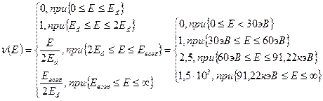 Каскадная функция υ - среднее число пар Френкеля, заключенное в каскадной области повреждения. Допущения: · Каскад представляет собой совокупность соударений двух тел; · Эти соударения независимы друг от друга; · При каждом соударении кинетическая энергия сохраняется, т. е. не происходит передачи энергии другим атомам решетки, кроме смещаемого. Запишем каскадную функцию в модифицированной модели Кинчина- Пиза:
