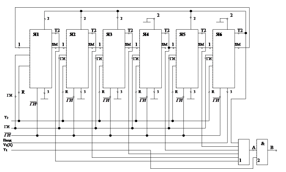 Типовые ячейки от Я1 до Я6 в этой схеме и включение генератора импульсов ГИ то же, что и в схеме кодера. В качестве сумматора по модулю 2 на входе первой ячейки, один вход которого подключен к точке, на которую последовательно во времени поступают сигналы кода, второй – к выходу ячейки Я6, используется сумматор по модулю 2, имеющийся в составе ячейки Я6. После приема кодового вектора V1 (x) в ячейках памяти при наличии обнаруживаемой ошибки получен остаток R(x)≠0. Факт наличия остатка фиксируется схемами «ИЛИ1» и «И2». При R(x)≠0 после приема всех разрядов кода А=1. В это время на второй вход схемы «И2» подается сигнал устройства управления Y1, равный 1. В течение времени, когда Y1=1 и A=1, выход в схеме «И2» также равен 1. Этот сигнал подключается к устройству запрета считывания принятой информации. После Y1=1 формируется Y2=1, сбрасывающий схему деления в исходное состояние. На первых 31 тактах осуществляется прием V1 (x) и вычисление остатка. На первой половине 32 такта сигналом Y2=1 все ячейки схемы деления сбрасываются в исходное состояние, равное 0, после чего эта схема готова к приему нового вектора. 9. Заключение В данной курсовой работе был выбран БЧХ-код, определена вероятность ошибки на символ, вероятность трансформации кодовой комбинации, вероятность подавления и вероятность правильного приема, минимальное кодовое расстояние. По этим параметрам построен генераторный полином, который полностью определяет БЧХ-код. Был рассмотрен принцип работы кода, по которому построены блок-схемы кодера и декодера кода. Далее по полученному алгоритму были построены функциональные схемы кодера и декодера. Список используемой литературы 1. Методические указания к курсовой работе «Расчет оценок показателей достоверности приема дискретной информации. Проектирование кодера и декодера БЧХ-кода». Л. А. Баранов, МИИТ 2000 г. 2. Лекции по курсу «Статистическая теория связи» Л. А. Баранов. 2006. |