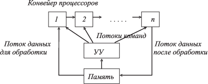 Тип ОКМД — "один поток команд — много потоков данных" (SIMD — "Single Instruction — Multiplе Data") охватывает ВС, в которых одной командой обрабатывается набор данных, множество данных, вектор, и вырабатывается множество результатов. Это векторные и матричные системы, в которых по одной команде выполняется одна и та же операция над всеми элементами массива — вектора или матрицы, распределенными между процессорными (обрабатывающими) элементами ПЭ или процессорами. Принцип обработки показан на рис. 1.2.2.