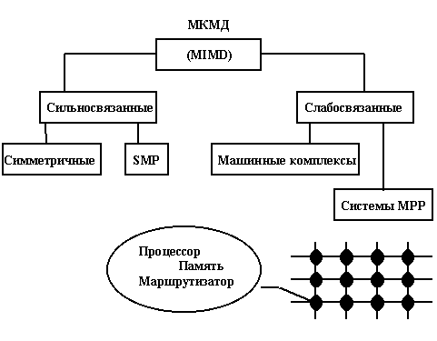 МКОД - структуры большой практической реализации не получили. Задачи, в которых несколько процессоров могли эффективно обрабатывать один поток данных, в науке и технике неизвестны. С некоторой натяжкой к этому классу можно отнести фрагменты многофункциональной обработки, например обработку на разных процессорах команд с фиксированной или плавающей точкой. Так же как фрагмент такой структуры, можно рассматривать локальную сеть персональных компьютеров, работающих с единой базой данных, но скорее всего это - частный случай использования МКМД - структуры. Тип МКМД — "много потоков команд — много потоков данных" (MIMD — "Multiple Instruction — Multiple Data") cоответствует более полному и независимому распараллеливанию. К этому типу относятся, например, все многопроцессорные вычислительные комплексы (МВК) семейства "Эльбрус". МКМД - структуры являются наиболее интересным классом структур вычислительных систем. После разочарований в структурах суперЭВМ, основанных на различном сочетании векторной и конвейерной обработки, усилия теоретиков и практиков обращены в этом направлении. Уже из названия МКМД - структур видно, что в данных системах можно найти все перечисленные виды параллелизма. Этот класс дает большое разнообразие структур, сильно отличающихся друг от друга своими характеристиками (рис. 1.2.4). Важную роль здесь играют способы взаимодействия ЭВМ или процессоров в системе. В сильносвязанных системах достигается высокая оперативность взаимодействия процессоров посредством общей оперативной памяти. При этом пользователь имеет дело с многопроцессорными вычислительными системами. Наиболее простыми по строению и организации функционирования являются однородные симметричные структуры. Они обеспечивают простоту подключения процессоров и не требуют очень сложных централизованных операционных систем, размещаемых на одном из процессоров. Однако при построении таких систем возникает много проблем с использованием общей оперативной памяти. Число комплексируемых процессоров не может быть велико, оно не превышает 16. Для уменьшения числа обращений к памяти и конфликтных ситуаций могут использоваться многоблочное построение ОП, функциональное закрепление отдельных блоков за процессорами, снабжение комплексируемых процессоров собственной памятью типа "кэш". Но все эти методы не решают проблемы повышения производительности ВС в целом. Аппаратные затраты при этом существенно возрастают, а производительность систем увеличивается незначительно.