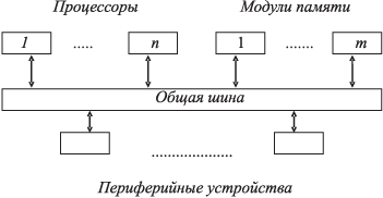 1.4 Способы межмодульного соединения (комплексирования)Различают два противоположных способа комплексирования: с общей шиной (шинная архитектура) и с перекрестной (матричной) коммутацией модулей ВС (процессоров, модулей памяти, периферии). На рис.1.4.1 представлена система с общей шиной. Шина состоит из линий, по которым передаются информационные и управляющие сигналы.