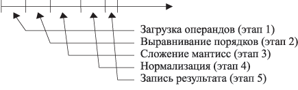 Пусть реализуется поток команд одного процессора или существует доступ к этому устройству нескольких процессоров так, что в каждом такте возможно задание на выполнение сложения новой пары чисел. Тогда временная диаграмма работы конвейера может иметь вид, представленный на рис. 3.1.2