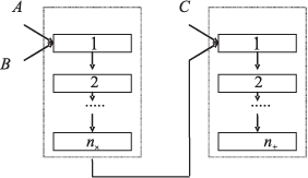 Выберем время такта — величину tT = max ti } и потребуем при разбиении на этапы, чтобы для любого i = 1, ...,n выполнялось условие ti + t(i+1) mod n > tT . Т.е. чтобы никакие два последовательных этапа (включая конец и новое начало операции) не могли быть выполнены за время одного такта. Функциональные узлы, выполняющие последовательные этапы одной операции, целесообразно выстроить в единую конвейерную линию, где устройство, выполняющее некоторый этап, закончив его для операции над одним набором данных, переходило бы в следующем такте к выполнению этого же этапа той же операции для другого набора исходных данных. Например, на рис. 3.1.1 представлен конвейер выполнения операции сложения.
