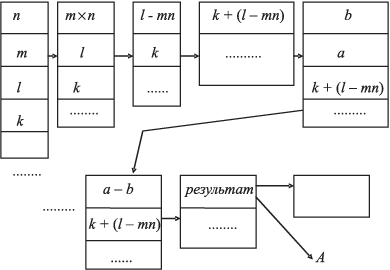 Здесь два конвейера образовали один, с глубиной перекрытия n = n× + n+ . Очередной результат умножения немедленно направляется на конвейер сложения, куда параллельно направляется необходимый сомножитель. 3.3 Выполнение операций на стекеВ вычислительной технике повсеместно используется такая структура данных, как стек. Его применение при выполнении арифметических и логических операций в арифметическо-логическом устройстве (АЛУ) позволяет реализовать безадресную систему команд, что, в свою очередь, дает возможность минимизировать число обращений к оперативной памяти, осуществить буферизацию при многоуровневой памяти, кодировать большое число команд в одном слове. Рассмотрим механизмы обработки информации на стеке и формирования безадресных команд. Прежде всего - об идее применения безадресных команд. Рассматривая структуру команд, мы можем отметить, что практически команды бывают одно-, двух-, трехадресные. Трехадресная команда, как правило, по законченности соответствует одному оператору, т.к. отображает действие над двумя операндами и результат. Двухадресная команда — это такая команда, где один из адресов подразумевается (например, аккумулятор или сумматор), или результат направляется по одному из указанных адресов. То же касательно одноадресной команды: по числу адресов - число обращений к памяти, не считая считывания самой команды. Возникает вопрос: можно ли отделить загрузку регистров сверхоперативного запоминающего устройства (СОЗУ) от собственно выполнения команды, сделать эту загрузку опережающей, выполнение команды производить только с использованием подразумеваемых адресов СОЗУ и при этом в целом минимизировать количество обращений к ОП? Ответ приводит к структуре безадресных команд и к выполнению операций на стеке. Стек представляет собой множество последовательно пронумерованных регистров СОЗУ или ячеек ОП, снабженное указателем вершины стека УВС, в котором автоматически при записи и считывании устанавливается номер (адрес) последнего занятого регистра — вершины стека. При записи в стек (загрузка стека) слово пишется в следующий по номеру регистр, а УВС увеличивается на единицу. При считывании извлекается слово с адресом, указанным в УВС. Затем УВС уменьшается на единицу. Таким образом, в стеке реализуется правило последний "пришел — первый ушел". Адреса памяти фигурируют только в командах загрузки стека и записи из стека в память. Значения выражений можно вычислять полностью безадресным способом. Команда, состоящая только из кода операции, извлекает из стека один или два операнда, выполняет операцию и заносит результат в стек. На рис. 3.3.1 приведен пример преобразования стека при выполнении трех команд программы. Рис. 3.3.1 Выполнение команд на стеке Вычисления с использованием стеков удобно задавать, описывать и программировать с помощью польской инверсной (бесскобочной) записи арифметических выражений ПОЛИЗ (предложил польский математик Лукашевич в 1929 г.). Запись производится по правилу "читаем арифметическое выражение слева направо и последовательно друг за другом выписываем встречающиеся операнды". Как только окажется, что все операнды некоторой операции выписаны, записываем знак этой операции, условно учитываем вместо операндов и знака операции потенциальное имя ее результата. Это може