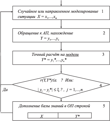 надо только быть уверенным в достижении нужной точности. Однако в повседневной жизни мы очень часто решаем трудноформализуемые задачи, когда алгоритм решения не очевиден. Но мы учимся, обретаем опыт, затем оцениваем складывающуюся ситуацию на "похожесть" и принимаем решение. Простейшая задача: как мы автоматически определяем, на сколько надо повернуть рулевое колесо, чтобы остаться на дороге? Ведь первый раз мы въезжали в бордюр! Значит, некая таблица постепенно сложилась и зафиксировалась в нашем сознании. Пожалуй, наиболее полно автоматически и с наибольшей практичностью решение задачи самообучения представлено в артиллерии, точнее — в правилах стрельбы. После занятия огневой позиции подготовка установок для ведения огня занимает много времени. На рассчитанных установках по каждой цели производится пристрелка, когда цель захватывается в широкую вилку, затем по наблюдениям вилка "половинится" до тех пор, пока на середине узкой вилки не переходят на поражение. После стрельбы следует замечательная команда "Стой, записать...", по которой наводчик на щите орудия пишет номер цели и все пристрелянные установки по ней. Такая работа проделывается и по фиктивным целям — реперам. Постепенно при "работе" на данной местности запоминаются пристрелянные установки по многим целям и реперам. С их появлением и развитием подготовка данных по вновь появляющимся целям резко упрощается, т.к. сводится к переносу огня от ближайшей цели или репера, т.е. к внесению поправок по дальности и направлению. Доказано, что при этом достаточно сразу назначать захват цели в узкую вилку, т.е. пристрелка упрощается. Правила стрельбы существуют века, однако вряд ли кто-то осознавал теоретически, что речь идет о реализации самообучающейся системы. Для трудноформализуемых задач управления или для увеличения производительности вычислительных средств известно так называемое ситуационное управление. Оно заключается в том, что для каждого значения вектора, описывающего сложившуюся ситуацию, известно значение вектора, описывающего то решение, которое следует принять. Если все ситуации отразить невозможно, должно быть задано правило интерполяции (аналог интерполяции, обобщенной интерполяции). Итак, пусть исходная ситуация характеризуется вектором X = {x1 , ..., xm }. По значению X, т.е. по его компонентам, принимается решение Y, также представляющее собой вектор, Y = {y1 , ..., yn }. (Значения X и Y могут определяться целыми и вещественными, булевыми. Изначально они могут иметь нечисловую природу: "темнее — светлее", "правее — левее", "ласковее — суровее" и т.д. Мы не будем рассматривать проблему численной оценки качественных или эмоциональных категорий.) Предположим, для любых двух значений X1