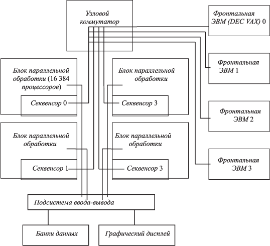 т.е. информацией о новом полученном опыте. Однако динамика развития и уточнения АП как базы знаний представляется иной. Далеко не всегда по ошибочному принятию решений целесообразно развивать базу знаний. "Учение на ошибках" может привести к трагедии (или к частному срыву процесса управления), особенно на этапе обучения системы. Обучение системы целесообразно проводить на достаточно точной модели, максимально использующей точный расчет компонент решения. Применение модели для обучения используется не только на специально предусмотренном этапе обучения системы, но и вне реального цикла управления, т.е. когда система работает в режиме дежурства, параллельно с функциональным контролем. Тогда алгоритм ее работы представлен на рис. 4.2.2. Рис. 4.2.2 Самообучающаяся система управления 4.3 ВС Connection MachineВ упомянутом выше "Японском вызове" провозглашалась необходимость объединения в одну систему десятков и сотен тысяч микропроцессоров. К такому опыту можно отнести семейство ВС, разработанное фирмой Thinking Machine. Оно является единственной крупной коммерческой реализацией идей ОВС. СМ-1 выпущена в 1986 г. Через год была выпущена СМ-2 с удвоенной производительностью в 2,5 млрд.оп./с. О ней следует говорить в связи с попытками воспроизвести ее в нашей стране на архитектурном уровне. СМ-2 комплектуется (рис. 4.3.1) из блоков параллельной обработки по 16 К узловых одноразрядных процессоров (элементарных процессоров — ЭП) каждый. В комплекс входят до 8 фронтальных ЭВМ, на которых реализуется вычислительный процесс. (Следовательно, как в ПС-2000, собственно блоки СМ образуют интеллектуальный терминал для выполнения операций по заявкам фронтальных (там — мониторной) ЭВМ.) Рис. 4.3.1 Схема масспроцессорной системы Connection Machine Узловой (матричный) коммутатор обеспечивает связь фронтальных ЭВМ с секвенсорами блоков параллельной обработки в соответствии с вычислительным процессом и заявками пользовательских задач. Подсистема ввода-вывода связывает блоки параллельной обработки с периферийными устройствами массовой памяти и графическими дисплеями. Секвенсор — специализированная 96-разрядная микро-ЭВМ управления параллельной обработкой. На входе он получает поток высокоуровневых команд виртуальной машины (образуемой множеством фронтальных ЭВИ) и аргументов. Они передаются от коммутатора. На выходе он генерирует последовательность низкоуровневых команд элементарных обрабатывающих процессоров, команды синхронизации и операций с памятью. Основные операции производятся над 32-разрядными данными. Для выполнения их используются по 32 элементарных процессора. Поэтому каждые 32 ЭП имеют акселератор для выполнения операций с плавающей запятой, в том числе — с двойной точностью. Память (RAM — прямоадресуемая, с произвольным доступом) распределенная. Каждый ЭП имеет 64 Кбит. Т.е. общий объем памяти — 512 Мбайт (в 64 К-процессорном варианте). Ассемблер обеспечивает богатый набор от простых арифметических и логических операций до высокоуровневых APL-подобных операций (APL — параллельный PL, ЯВУ). Реализован микропрограммно в секвенсорах, и, как говорилось выше, этим обеспечивается преобразование потока высокоуровневых команд и аргументов на языке Paris в последовательность элементарных операций обрабатывающих процессоров. 4.4 Нейронные сети и нейрокомпьютерыПрименяемые не
