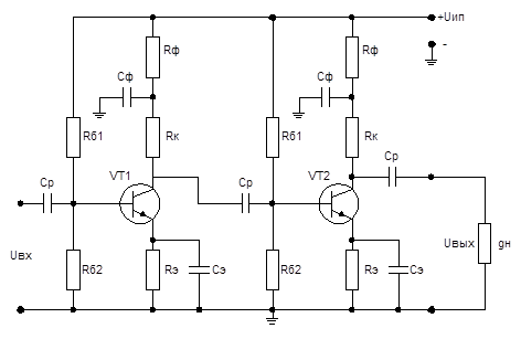 Расчет апериодических и импульсных усилителей Усиление низкочастотных и импульсных сигналов осуществляется апериодическими усилителями. Типовая схема двухкаскадного резистивного усилителя представлена на Рисунок 1.