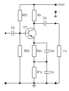 Расчет каскада с НЧ коррекцией осуществляют в такой последовательности. 1. Задаются требуемыми значениями коэффициента усиления 2. Определяют, по необходимости, значение коллекторного сопротивления 3. В соответствии (5.2) определяют постоянную времени 4. Находят необходимые для осуществления коррекции значения