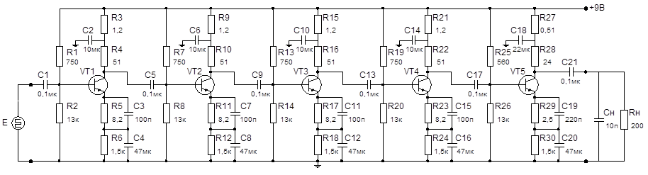 Нетрудно заметить, что неравенство верно, а, следовательно, согласовывающий каскад можно не ставить. - Источник питания на 9 В; - Верхняя граница температурного диапазона - Нижняя граница температурного диапазона - Входной сигнал не более 5 мВ. - Остальные характеристики соответствуют ТЗ. Видеоусилитель. Принципиальная схема.