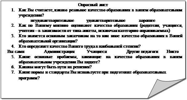 Литература1. Крупнов Б.В. Экспериментальная площадка Московского комитета образования «Разработка системы конструирования и испытания экспериментальных учебников». Труды Института учебника «Пайдейя». Сб. ст. Вып. 1. Испытание и конструирование учебно-методических средств. – М.: Институт учебника «Пайдейя», 2001. 2. Карпов П.В. Рефлексивный анализ организации испытания учебника Т. Н. Павловой «Здоровое питание». Труды Института учебника «Пайдейя». Сб. ст. Вып. 1. Испытание и конструирование учебно-методических средств. – М.: Институт учебника «Пайдейя», 2001. 3. Крупнов Б.В., Карпов П.В., Андрианова Е.П. Методология испытания учебно-методических средств (опыт испытания информационных материалов ФАО). Труды Института учебника «Пайдейя». Сб. ст. Вып. 1. Испытание и конструирование учебно-методических средств. – М.: Институт учебника «Пайдейя», 2001. 4. Громыко Ю.В. Предисловие к методическому пособию Т.М. Губановой «Опыты мыследеятельностной педагогики». М.: Институт учебника «Пайдейя», 1998. Лабораторная работа №4. Определение субъектов - организаторов пространства работы по обеспечению качества образования в образовательном учреждении.Цель работы : Проведение самостоятельного исследования по обеспечению качества образования в конкретном образовательном учреждении. Ход работы