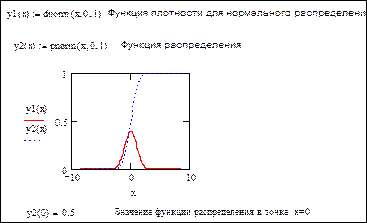 Рис. 10 Однако, если значение Хвосты равно 2, то будет подсчитана вероятность того, что, случайная величина превзойдет по модулю значение x . Можно показать, что СТЬЮДРАСП(0,5;10;2) = 0,627. Поскольку функция плотности симметрична, то значение вероятности в первом случае в два раза меньше вероятности для второго случая. При вызове функции СТЬЮДРАСПОБР необходимо в диалоговом окне задать только два параметра, а именно это значение вероятности и число степеней свободы, на основании которых будет вычислено значение односторонней критической точки. Функции FРАСП и FРАСПОБР работают с распределением Фишера и запрашивают кроме стандартных аргументов значение двух степеней свободы. Если значение вероятности равно 0,05, то можно получить значения функции, например FРАСПОБР(0,05;1;1) = 161,4462, FРАСПОБР(0,05;10;100) = 1,926693. Данные функции являются обратными и нетрудно проверить, что FРАСП(0,9;5;7) = 0,529785; а FРАСПОБР(0,529;5;7) = 0,901545. Описанных выше статистических функций Excel достаточно для вычисления значений распределений, однако мало для построения графиков как функций распределения, так и функций плотности. Поэтому кратко рассмотрим математический пакет MathCad. Математический пакет MathCad Для работы со случайными величинами в данном пакете имеется богатая библиотека встроенных функций, которые позволяют находить различные значения наиболее распространенных распределений. Каждое распределение представлено тремя функциями — плотность распределения, функция распределения и функция обратная к плотности распределения. Кроме этого имеется возможность генерировать выборки произвольно размера, с заданным законом распределения. Например, для работы с нормальным распределением предназначены функции: pnorm(x, m, s ), dnorm(x, m, s ), qnorm(p, m, s ), rnorm(n, m, s ). Функция dnorm(x, m, s ) возвращает значение функции плотности вероятности в точке x , при математическом ожидании m , и среднеквадратичное отклонение s . Функции pnorm(x, m, s ) возвращает значение функции распределения; а qnorm(p, m, s ) такое значение x , что F (x ) = p . Функция rnorm(n, m, s ) генерирует вектор длиной n случайных чисел, имеющих данное распределение. Подобное правило действует для всех встроенных функций можно интерпретировать следующим образом. Ели имеется некоторое имя некоторого распределения, то начальная буква d означает функцию плотности, буква p означает функцию распределения, буква q значение критической точки. Буква r перед именем функции позволяет генерировать вектор с заданным распределением. Приведем список функций, предназначенных для обработки основных распределений: · Нормальное распределение pnorm(x, m, s ), dnorm(x, m, s ), qnorm(p, m, s ), rnorm(n, m, s ). · Логарифмически нормальное распределение plnorm(x, m, s ), dlnorm(x, m, s ), qlnorm(p, m, s ), rlnorm(n, m, s ). · Распределение хи -квадрат pchisd(x, d ), dchisd (x, d ), qchisd (p, d ), rchisd (n, d ). · Распределение Стьюдента pt(x, d ), dt(x, d ), qt(p, d ), rt(n, d ). · Распределение Фишера pF(x ,d 1 ,d 2 ), dF(x ,d 1 ,d 2 ), qF(p ,d 1 ,d 2 ), rF(n ,d 1 ,d 2 ). · Равномерное распределение punif(x ,a ,b ), dunif(x ,a ,b ), qunif(p ,a ,b ), runif (n ,a ,b ). Пример документа MathCad, в котором строятся графики функция плотности и распределения для стандартного нормального распределения, имеет вид: