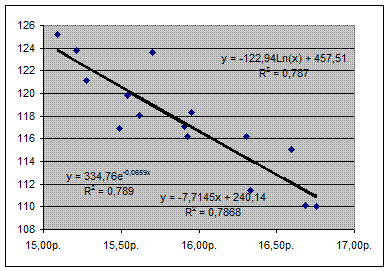 Рис. 11 То есть имеем линейную модель: y = –7,7145x + 240,14 R2 = 0,786, экспоненциальную модель: y = 334,76e–0,0659 x R2 = 0,789, логарифмическую модель: y = –122,94Ln(x) + 457,51 R2 = 0,787. Если имеется выбор между несколькими моделями, то самый простой способ — это задавать различные уровни тренда и выбрать ту модель, у которой значение коэффициента детерминации будет максимальным. В данном случае значения коэффициентов детерминации несильно отличаются в различных моделях, поэтому нет объективных причин выбрать наилучшую, а следовательно, необходимо проводить дополнительные исследования либо используя среднюю ошибку аппроксимации, либо множественную регрессионную модель (которую мы будем рассматривать далее). Хотя нами и получены модели, среди которых нельзя сразу выбрать лучшую, необходимо помнить о том, что прогноз, полученный на основании каждой модели, будет различным. Как было показано ранее (лабораторная работа № 2), прогноз, в случае использования линейной модели, при x = 17 будет равен 109,014. Прогноз, полученный на основании логарифмической модели, равен 109,1948, а на основании экспоненциальной модели — 109,1927. Эти значения получены подстановкой в уравнения моделей значения x = 17. Использование результатов, полученных с помощью точечной диаграммы, имеет много недостатков. Во-первых, сам набор функций достаточно ограниченный, а одна из актуальных задач современной эконометрики заключается в подборе новых, более адекватных моделей, а во-вторых, проверять гипотезы о значимости коэффициентов, да и самой регрессии в целом придется вручную. К тому же посредством точечной диаграммы можно получить модель только для парного случая. Поэтому иногда более удобно использовать преобразования, а уже затем надстройку Регрессия . Как мы уже знаем из теории, любая из предложенных нелинейных моделей может быть сведена к линейной либо заменой переменных, либо логарифмированием. Поэтому в таблицу исходных данных добавляют дополнительные столбцы, в которых находятся значения логарифмов, а затем строят регрессионную модель между необходимыми столбцами. Однако в этом случае нужно помнить о том, что, переходя к линейной модели, посредством логарифмирования получают изменённые значения параметров, которые затем необходимо восстанавливать. Из экономической теории известно, что спрос является убывающей функцией цены, то есть при увеличении цены спрос убывает. Следовательно, разумной будет попытка найти лучшую модель среди убывающих функций. Имеется огромное количество функций, которые при некоторых значениях параметров являются убывающими, например, линейная, гиперболическая, показательная, с основанием меньше 1, и т. д. Рассмотрим способ построения показательной модели Таблица 10