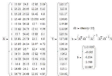 Учитывая, что матрица X должна иметь на один столбец больше, чем число регрессоров, в котором находятся единицы [5, c. 69], и вектор-столбец Y содержит значение спроса, документ MathCad может иметь следующий вид: