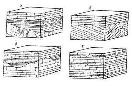 Рис. 3.4. Основные типы косой слоистости по Р. Шроку (1950). а – таблитчатый; б – линзовидный; в – клиновидный; г – блок-диаграмма, показывающая соотношения между таблитчатой и линзовидной косой слоистостью. Стрелкой показано направление течения. (Рис. 4.5. из Степанов, Месежников, 1979, с. 78). Важное значение слоистость имеет и при интерпретации структуры осадочных толщ в складчатых системах. Знание последовательности напластования позволяет, в частности, устанавливать опрокинутое залегание или разобраться в строении вертикально залегающих слоистых серий (рис. 3.5).