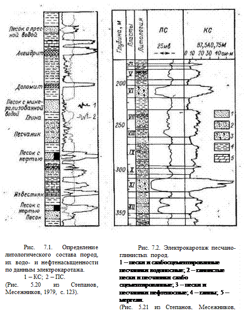 Электрокаротаж Это наиболее распространенный метод геофизического исследования скважин. Заключается он в непрерывном измерении по необсаженному стволу скважины естественных (спонтанных) потенциалов (с иноним — потенциалы собственной (спонтанной) поляризации), возникающих при взаимодействии промывочной жидкости и пластовых вод. Общепринятая аббревиатура для кривой получаемых значений — кривая ПС. Одновременно измеряется кажущееся удельное сопротивление горных пород, обусловленное удельным сопротивлением поровых вод и сопротивлением самой породы. Общепринятая аббревиатура — кривая КС. Измерение ПС производится двухэлектродной установкой, один электрод которой остается на поверхности, а второй опускается в скважину. Измерение КС выполняется четырехэлектродной системой, три электрода которой образуют каротажный зонд, опускаемый в скважину, а четвертый устанавливается на поверхности вблизи ее устья. Различия в физических свойствах горных пород (проницаемость, абсорбция, диффузия и др.) делают возможным диагностировать основные типы терригенных, глинистых и карбонатных отложений по кривым ПС и КС (рис. 7.1, 7.2). В частности, максимальные значения на кривой ПС имеют глины. Пески и песчаники, а также пористые и трещиноватые карбонаты (из-за более легкой диффузии глинистого раствора и небольшой абсорбционной активности), выделяют на кривой ПС минимумами значений. Причем эти минимумы выражены тем отчетливее, чем меньше глинистого материала содержат песчаные или карбонатные пласты. Напротив, кажущиеся сопротивления (кривая КС), прямо пропорциональные проницаемости пород, имеют максимальные значения у хорошо проницаемых пород — песков и песчаников, причем если в песчаных пластах вода замещается нефтью, то кажущееся сопротивление растет еще больше. Карбонатные породы также характеризуются максимумами на кривой КС, но их сопротивления могут резко меняться, так как трещиноватые зоны приводят к снижению значений. Значения КС горных пород зависят от степени минерализации пластовых вод. Они значительно понижаются, если пласты содержат воды с высокой минерализацией. Вследствие этого сопротивления глин могут в отдельных случаях значительно превышать сопротивления песков с минерализованной водой (Итенберг, 1972). «…Метод основан на измерении интенсивности естественного радиоактивного излучения осадочных пород (гамма-каротаж) или на изучении взаимодействия источников радиоактивного излучения и горной породы (нейтронный каротаж). Наибольшее значение при интерпретации геологических разрезов получил гамма-каротаж (ГК), применяемый как в необсаженных, так и в обсаженных скважинах. Гамма-каротаж сводится к измерению интенсивности гамма-излучения горных пород за счет содержащихся в них тория, урана и радиоактивного изотопа калия 40 К. По значениям естественной радиоактивности осадочные породы делятся на три группы: а) высокой радиоактивности; к ним относятся битуминозные глины, аргиллиты и глинистые сланцы, калийные соли, а также современные глубоководные осадки — глобигериновые и радиоляриевые илы;