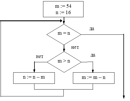 Ответ: 2. Обсуждение . Этой блок-схемой представлен алгоритм Евклида нахождения наибольшего общего делителя двух натуральных чисел. Этот алгоритм обязательно изучается в базовом курсе школьной информатики, поэтому его нетрудно распознать и получить ответ, не исполняя алгоритм по шагам. Конечно, такое распознавание весьма существенно экономит время выполнения задания, хотя и чревато ошибкой в том случае, если на самом деле алгоритм окажется лишь похожим на уже известный. Если же алгоритм исполняется его по шагам, то типичными ошибками является либо выполнение тела цикла на один раз меньше, либо наоборот – на один раз больше.