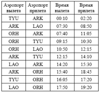 Какое выражение соответствует F? 1) ¬X /\ ¬Y /\ Z 2) X /\ Y /\ ¬Z 3) ¬X \/ ¬Y \/ Z 4) X \/ ¬Y \/ ¬Z А10 . Между четырьмя крупными аэропортами, обозначенными кодами ARK, LAO, ORH и TYU, ежедневно выполняются авиарейсы. Приведён фрагмент расписания перелётов между этими аэропортами: