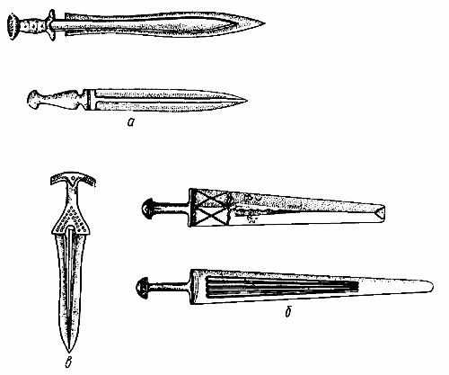 ![]() Появление усовершенствованных литых бронзовых топоров сыграло исключительную роль в развитии многих народов: облегчило строительство жилищ, изготовление других орудий труда и предметов быта, упростило освоение лесистых местностей земледельцами и т. п. Топор в эпоху бронзы, да и в более поздние периоды, был не только орудием труда, но и одним из главных видов оружия (наряду с копьями, стрелами и мечами). В Закавказье, в Центральной части территории СССР и в других местах такие топоры приобрели вид особого боевого топора-бердыша (рис. 2). Впервые бердыши появились, по-видимому, в Египте, а затем и в других странах. В России прообразом кованых бердышей послужили бронзовые боевые топоры. Позже, особенно после "появления огнестрельного оружия, такие топоры утеряли боевое назначение, они стали отличительными знаками военачальников, административных работников и т. п., превращаясь часто в произведения искусства (украшались литыми и чеканными изображениями, богатой инкрустацией). Почти во всех странах с развитием бронзолитейного дела эволюция литых топоров шла по двум направлениям: улучшались ударные качества за счет изменения формы и соотношений элементов и совершенствовалась техника литья, развивались элементы, присущие художественным отливкам. Из двух основных типов топоров древности — вислообушных и кельтов — наибольшее разнообразие форм встречается у первых (рис. 3). Их изготовление требовало высокого развития литейного ремесла: сложная конфигурация отливки и наличие отверстия сильно усложняли устройство разъемных каменных форм. Не менее трудно было лить кельты (рис. 4), хотя они обладали не такой сложной конфигурацией, как вислообушные топоры. Наличие глубокого отверстия, литых изображений на наружных поверхностях и неравностенность кельтов требовали от литейщиков такого же умения и мастерства, как и при изготовлении сложных художественных отливок. К тому же следует отметить, что литье кельтов в большинстве стран производилось на первых этапах возникновения литейного ремесла. О высоком уровне техники литья кельтов свидетельствуют находки в могильнике Кавказа около станции Сейма, близ г. Горького и в других местах. Найденные кельты оказались особенно высокого качества. ЛИТЫЕ МЕЧИ И МОТЫГИ О литых мечах уже говорилось раньше. Они, как и топоры,— одни из первых отливок в истории литья. Вряд ли можно найти хоть один народ, который, владея мастерством литья, не изготовлял бы бронзовых мечей. Этого требовали как хозяйственные работы, так и нужды защиты. Мечи раньше других бронзовых изделий становятся произведениями искусства (рис. 5, а). Со времени появления первых литых бронзовых мечей и до современных, изготовляемых самыми различными приемами, оттенок художественности является обязательным их атрибутом. А изделия русских оружейников во многих случаях становятся непревзойденными произведениями искусства. Древние мечи, найденные при археологических раскопках, часто снабжены не только замысловатыми рукоятями с литыми узорами, но и богатой инкрустацией из серебра, золота и драгоценных камней. Любыми средствами литейщики придавали оружию оттенок художественности, привлекательности. На рис. 5, б изображены цельнолитые бронзовые мечи, изготовленные в Закавказье в I тысячелетии до н. э. Они снабжены орнаментированны