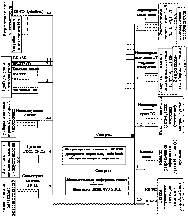 11.6. Применение для построения системы на ИУТК «Гранит-микро» элементов сетевой конфигурации линий связи (линия связи, организующая межуровневые (сетевые) сопряжения КП - RTU, выделена жирной линией).