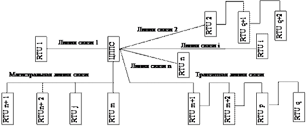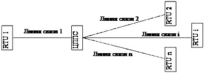11. Конфигурация связей КП - RTU с ЦППС ИУТК «Гранит-микро» для различных линий связи В ИУТК «Гранит-микро» и, соответственно, в ИК АСКУЭ могут использоваться линии (каналы) связи: -радиальные, -магистральные, -цепочечные (транзитные), -произвольные, состоящие из сочетания указанных выше видов линий связи. В качестве среды передачи информации могут использоваться: -выделенные пары проводов, -ВЧ каналы связи, организованные по ЛЭП и их аналогам, -радиоканалы связи, организованные аналоговыми радиостанциями, -радиоканалы связи, организованные цифровыми модемами (например, типа «Гранит», Россия), -радиоканалы связи, организованные с помощью GSM модемов, -цифровые каналы связи - оптоволоконные, Radio Ethernet. Конфигурации связей КП с ЦППС приведены ниже. 11.1. Радиальные линии связи