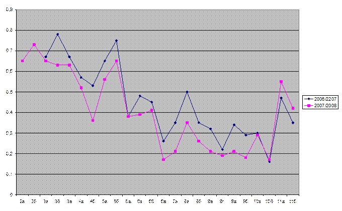 В диаграмме наблюдается высокое качество ЗУН в начальном звене, которое снижается в параллелях среднего звена и 10 классах. В выпускных 11 классах качество ЗУН резко повышается. Подобные изменение характерны для всех образовательных учреждений и объясняются возрастными и психологическими особенностями учащихся школьного возраста. Диаграмма № 4 Сравнительная динамика качества образования учащихся по классам за 2006/2007 и 2007/2008 учебные годы