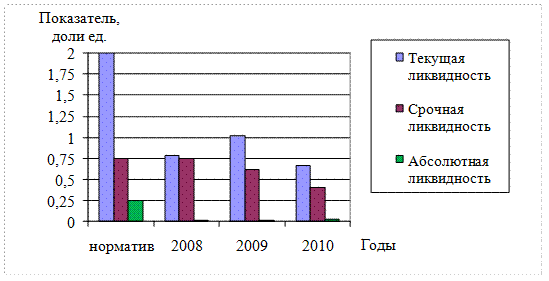 Рисунок 1.4 – Показатели ликвидности ООО «Диалог» за 2008 – 2010 гг. в сравнении с нормативными значениями 4.5.5 При оформлении диаграмм в черно-белом исполнении, следует обратить внимание на контрастность заливки рядов данных. Надписи в диаграммах выполняются шрифтом Times New Roman, 12 пт. В случае необходимости размер шрифта может быть уменьшен до 10 пт. 4.5.6 При построении диаграмм обязательно следует подписывать заголовки (наименования) осей и значения величин на них, а также указывать единицы измерения. 4.5.7 При ссылках на иллюстрации следует писать «в соответствии с рисунком 3» или «как видно из рисунка 2.3» и т.п. 4.6 Построение таблиц 4.6.1 Таблицы следует располагать непосредственно после текста, в котором они упоминаются впервые, или на следующей странице, а при необходимости - в приложениях к записке. 4.6.3 Таблицы, за исключением таблиц приложений, следует нумеровать арабскими цифрами сквозной нумерацией. Если в документе одна таблица, она должна быть обозначена «Таблица 1». Допускается нумеровать таблицы в пределах раздела. В этом случае номер таблицы состоит из номера раздела и порядкового номера таблицы, разделенных точкой. В конце номера точка не ставится. Таблицы каждого приложения обозначают отдельной нумерацией арабскими цифрами с добавлением перед цифрой буквенного обозначения приложения, например, «Таблица А.1», если она приведена в Приложении А. Наименование следует помещать над таблицей слева с абзацного отступа в одну строку с ее номером через тире. В конце наименования точка не ставится. Подписывать рисунки следует шрифтом Times New Roman, 14 пт, полуторным междустрочным интервалом, выравнивая текст «по ширине». Например: Таблица 1 – Износ основных производственных фондов ООО «Диалог» за 2007 – 2010 годы