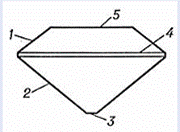 Элементы огранки бриллианта: 1 – коронка; 2 – павильон; 3 – кюласса; 4 – рундист; 5 – площадка Настоящая красота, блеск и феерическая «игра» лучей света у алмазов раскрывается и достигается в результате специальной механической обработки природных прозрачных кристаллов, которые после этого называются бриллиантами. Крупные бриллианты называются солитерами. Обработка заключается в раскалывании (обкалывании) или распиливании, последующей обточке и огранке кристаллов со всех сторон для придания им особой формы. Для ювелирной обработки алмазов специалисты используют специальный камнерезный и шлифовальный инструмент. Раскалывание алмазов позволяет при незначительных потерях сырья и небольших затратах труда разделять кристаллы на части для более эффективного их использования, в частности освобождаться от участков кристалла с дефектами и посторонними включениями. Эта операция требует большого мастерства, так как даже при одном неосторожном удар алмаз может быть превращен в осколки, непригодны для изготовления бриллиантов. Распиливание алмазов необходимо для разделения природных кристаллов на части при переработке их в бриллианты. Оно применялось уже в XVII в. В те времена для распиливания алмазов использовались железная проволока, шаржированная алмазным порошком. Процесс распиливания крупных кристаллов длился много месяцев, и при этом расходовалось большое количество алмазной крошки. Распиливание алмаза «Регент», весившего 410 карат, длилось около двух лет. Позднее появились алмазные пилы, существенно не отличающиеся от современных. Обточка алмазов – одна из самых ответственных операций в технологической цикле изготовления бриллиантов. От нее в значительной мере зависит степень использования сырья и качество готовых камней. Цель обточки состоит в том, чтобы придать заготовке форму будущего бриллианта, подготовить его к огранке и вывести все или хотя бы часть дефектов. Форма будущего бриллианта в значительной мере зависит от исходной формы алмаза. Огранка - механическая обработка (гранение и полировка) природных и синтетических драгоценных и полудрагоценных камней для ювелирных и технических целей. Огранка придает эстетичную форму, выявляет природную красоту камня и специфические для каждого минерала признаки: цвет, блеск, прозрачность, дисперсию света (способность минерала разлагать белый свет на разные цвета), плеохроизм, иризацию, опалесценцию и др. Самоцветное сырье обычно имеет невзрачный вид: когда английскому королю Эдуарду VII подарили крупнейший в мире алмаз «Куллинан», король был разочарован его сходством «с обычной стекляшкой» и сказал, что на улице «отшвырнул бы его в сторону, как простой булыжник». Технологию обработки определяют природная форма, размер кристаллов, их прозрачность, распределение окраски, оптические свойства и др. Обычно стремятся максимально сохранить массу камня, учесть неравномерность распределения окраски, наличие включений, трещин и других пороков. Огранке подвергаются драгоценные и полудрагоценные камни — алмаз, изумруд, рубин, сапфир, шпинель, аквамарин, топаз, турмалин и др., обладающие высокой твердостью, прозрачностью, красивым цветом и дисперсией; полупрозрачные и непрозрачные минералы с красивым цветом, рисунком и достаточной твердостью — агат, сердолик, яшма, би
