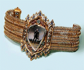Алмаз, золото, изумруды, эмаль. Вторая четверть XIX в. Плоский портретный алмаз (около 25 кар.) редкой чистоты и величины. Это самый большой портретный камень мира, один из семи исторических камней Алмазного фонда России.