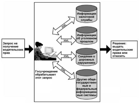 Рисунок - Гипотетическая система выдачи водительских прав, использующая XML Чтобы прояснить суть этих подходов к организации межведомственного взаимодействия и интеграции информационных систем, рассмотрим простые базовые понятия, связанные со стандартами XML и веб-службами. Первое и главное, что следует отметить, — это то, что все описываемые ниже стандарты являются открытыми, а в их разработке принимают участие такие ведущие ИТ-компании, как Microsoft и IBM, а также органы стандартизации Интернет-сообщества в лице консорциума World Wide Web Consortium (W3C) и организации UDDI.org. Это имеет особую важность, поскольку государство должно ориентироваться на открытые стандарты интеграции. Второе. Данные технологии не зависят от платформы и не требуют от организаций, чьи приложения интегрируются, использовать такие общие платформенные продукты, как операционные системы и СУБД. По своей сути XML — это мета-язык для представления данных. Термин «мета» используется потому, что XML-документ не только содержит в себе данные, но также несет информацию, описывающую эти данные. XML является такой же универсальной и базовой технологией для представления, трансформации и обмена данными, как транспортный протокол Transmission Control Protocol/Internet Protocol (TCP/IP) для Интернета. XML предоставляет общий формат для пересылки данных между приложениями. При этом сами данные могут по-прежнему храниться в прикладных системах и базах данных в своем внутреннем формате, но в случае необходимости их пересылки в другое приложение они будут трансформироваться в формат XML, как в промежуточный формат, понимаемый всеми системами. Уже сегодня стандарт XML поддерживается поставщиками основных платформенных программных продуктов. Все это не устраняет необходимость использования программного обеспечения промежуточного слоя пересылки сообщений (MOM), о котором речь шла выше, поскольку поток XML-данных и документов должен быть соответствующим образом маршрутизирован и, возможно, трансформирован для того, чтобы быть понятым целевым приложением. При этом XML-данные имеют текстовый формат и могут анализироваться сетевыми экранами и проходить за границы организаций. Таким образом, XML предлагает единое решение как для интеграции корпоративных приложений (EAI или A2A), так и для межведомственной B2Bi-интеграции. Одна из тенденций состоит в том, что наиболее передовые продукты интеграции класса систем управления бизнес-процессами (BPM), такие как Microsoft BizTalk Server, не только используют XML как формат обмена данными, но также используют синтаксис языка XML для описания бизнес-логики и контроля маршрутов и потоков прохождения сообщений и документов. В частности, Microsoft, IBM и ряд других поставщиков разработали язык Business Process Execution Language for Web Services (BPEL4WS) в качестве стандартного XML-языка описания бизнес-процессов. Это обеспечивает то, что новые приложения будет еще легче интегрировать в общие бизнес-процессы, а сама логика бизнес-процессов может быть легко доступна для модификации. Это также дает возможность создания репозитария стандартных государственных бизнес-процессов, что лежит в основе электронных административных регламентов. Еще одна тенденция состоит в том, что прикладные системы все в большей степени реализуются в виде компонентов, так называемых веб-служб, функциональные возможности которых доступны для пользов