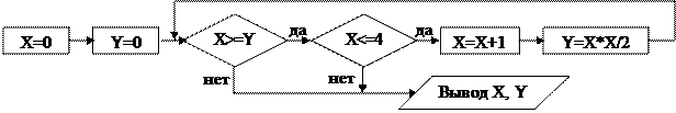 – цикла с постусловием – линейного типа – цикла с предусловием – ветвления Вопрос №17. В представленном фрагменте тело цикла выполняется ______ раз : B:=10; D:=40 Начало цикла: пока D>=B D:=D-B Конец цикла. – 4 – 3 – 1 – 2 Вопрос №18. Дан фрагмент программы : X:=5 Z:=7 вывод ("X=",X," X=",Z,Z+X) Оператор вывода выдаст строку результатов: – X=5 X=712 – "X=",5," X=",7,12 – X=5 X=7 12 – "X=",X," X=",Z,Z+X Вопрос №19. Представлен фрагмент алгоритма : B:=10; D:=30 Начало цикла: пока D>=B D:=D-B Конец цикла Переменная в после его выполнения примет значение : – 0 – 30 – 20 – 10 Вопрос №20. Приведён текст процедуры ABCD: Начать Писать ("Введите "A,B,C,D") Читать(A,B,C,D) Если A=B то Если С<В то Х:=1 Иначе Х:=2 Иначе Х:=3 Конец Эта процедура реализует выражение вида : – Х=1, если A=B и C<D Х=2, если A=B Х=3, если A<>B и C>=D – Х=1, если A=B и C<D Х=2, если A=B и C>=D Х=3, если A<>B – Х=1, если A<B и C<D Х=2, если A=B Х=3, если A<>B и C>=D – Х=1, если A<B Х=2, если A<=B и C<D Х=3, если A<>B и C>=D Вопрос №21. Представленный фрагмент блок-схемы вычисляет :