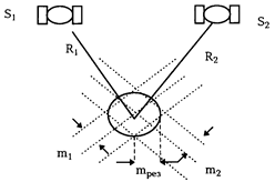 а) б) Рис. 2.6. Двухмерное определение местоположения пункта Р при различных удалениях спутников друг от друга. Если измеряемые до спутников S1 , и S2 , расстояния R1 , и R2 измеряются с погрешностью m1 , и m2 , то при использовании метода линейной засечки местоположение определяемого пункта Р будет находиться в пределах показанной на рисунке 2.6.а области, получившей название эллипса ошибок. В случае взаимно перпендикулярных направлений на наблюдаемые спутники эллипс деформируется в окружность (рис. 2.6.б) В этом случае достигается минимальное влияние расположения спутников на точность производимых определений. Если же угол между направлениями приближается к 0° или к 180°, то эллипс становится весьма вытянутым. Погрешность определения координат определяемого пункта существенно возрастает. Применительно к характерным для GPS трехмерным измерениям эллипс ошибок переходит в двухосный эллипсоид. Параметр, оценивающий возрастание погрешности измерений из-за геометрии расположения спутников, получил название геометрического фактора, который в современных публикациях принято обозначать аббревиатурой DOP (Delution of Precision - понижение точности). Этот параметр используется как связующее звено между результирующей точностью позиционирования и точностью измерений расстояний до спутников: