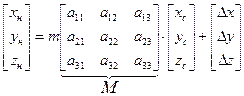 Здесь: m – масштабный коэффициент (m +1 ); М – ортогональная матрица, ее элементы однозначно выражаются через три угла Кардана;