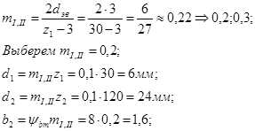 Расчет на контактную прочность показывает, что выбранный материал – сталь 40Х годится по условиям контактной прочности. б) определение основных размеров зубчатых колес. ([2, ч.2, с. 87]) Ступень IV, V: d7 = mIV , V ×z7 = 0.4×30 = 12 мм; d8 = mIV , V ×z8 = 0.4×300 = 120 мм; b7 = b8 = mIV, V ×ybm = 0.4×8 =3,2 мм. Ступень III, IV: d5 = mIII , IV ×z5 = 0.3×30 = 9 мм; d6 = mIII , IV ×z6 = 0.3×120 = 36 мм; b5 = b6 = mIII, IV ×ybm = 0.3×8 =2.4 мм. Ступени II, III. d3 = mII , III ×z3 = 0.2×30 = 6 мм; d4 = mII , III ×z4 = 0.2×120 = 24 мм; b4 = b3 = mII,III ×ybm = 0.2×8 =1,6 мм. Ступени I,II. d1 = mII , III ×z3 = 0.1×30 = 3мм; d2 =mII , III ×z4 = 0.1×120 = 12 мм; b2 = b1 =mII,III ×ybm = 0.1×8 =0,8 мм. Сравнение габаритов выбранного двигателя и в особенности размеров его вала с размерами шестерни 1-ой ступени показывают, что диаметр вала двигателя, равный 3 мм равен диаметру делительной окружности шестерни d 1 ,что не позволяет при классической ее конструкции закрепить ее на валу. Это несоответствие размеров требует: - либо увеличение диаметра шестерни (за счет увеличения модуля или числа зубьев); - либо разработки особой конструкции крепления шестерни на валу. Остановимся на первой возможности, т.е. увеличении модуля: