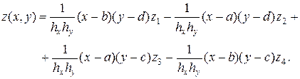 Вычислим значение температуры в граничных узлах (Т3 – Т9 ) сетки по заданной функции на границе T(x,y)=xy+x+y и подставим в систему уравнений (2). Получим систему для определения неизвестных значений T1 и T2 : Искомое решение T1 =3, T2 = 5. Выбор числа узлов сетки зависит от требуемой точности. Зная значения температуры в узлах, можно найти температуру в любой точке области, применяя интерполяционные формулы для функций нескольких переменных. Если значения функции z=f (x,y ) известны в вершинах прямоу-гольника a £ х £ b, c £ y £ d : z 1 = f ( a , c ) , z 2 = f ( b , c ), z 3 = f ( b , d ), z 4 = f ( a , d ) , то в любой точке (x,y ) этого прямоугольника значения функции z=f(x,y) могут быть найдены по следующей формуле (hx = b - a, hy = в - c ):
