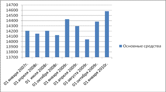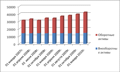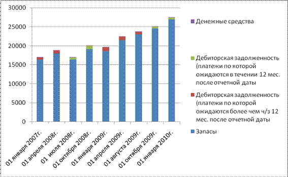 Рисунок 2.2 - Динамика активов предприятия Положительное влияние на рост запасов оказало увеличение сырья, материалов и других аналогичных ценностей на 143,37 %, что составило 7445 тыс. руб., в течение всего анализируемого периода наблюдается рост данной строки баланса, наибольшее увеличение – в третьем квартале 2009г., когда произошло увеличение на 119,21 % (6273 тыс.руб.). Увеличение является положительной тенденцией, так как говорит о расширении объемов производства.