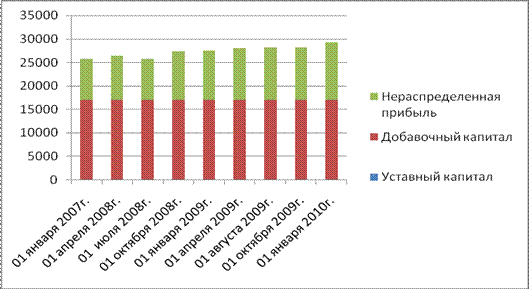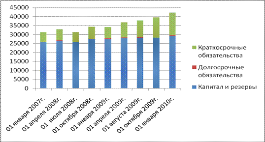 Рисунок 2.6 - Динамика краткосрочных обязательств Также на рост кредиторской задолженности повлиял рост задолженности перед персоналом по оплате труда на 61 тыс.руб. или 18,77 %, это является отрицательной тенденцией, так как говорит о том, что предприятие не погашает задолженность перед персоналом по оплате труда; увеличение задолженности перед государственными внебюджетными фондами на 195 тыс. руб., удельный вес на конец отчетного периода составил 1,80 %; увеличение задолженности по налогам и сборам до 412 тыс. руб., что отрицательно сказывается на деловой активности предприятия. Задолженность перед прочими кредиторами в анализируемом периоде уменьшилась на 125 тыс. руб., удельный вес в пассиве уменьшился с 2,03 % до 1,21 %, что является положительным моментом, так как сокращаются обязательства по выплатам. Удельный вес займов и кредитов возрос с 12,03 % до 16,84 %, изменение составило 3331 тыс.руб., что говорит о зависимости предприятия от внешних кредиторов. На изменение структуры краткосрочных обязательств оказало уменьшение резервов предстоящих расходов, которые сократились на 100 % еще в третьем квартале 2008г. Капиталы и резервы в текущем периоде повысились на 3639 тыс.руб., или 14,13 %. Решающую роль в изменении капиталов и резервов сыграло увеличение нераспределенной прибыли отчетного года на 3630 тыс.руб. (41,86 %) что положительно влияет на развитие предприятия, так как у предприятия имеются средства для реинвестирования на нужды развития. В течение всего анализируемого периода наблюдается стабильный рост данного показателя, за исключением второго квартала 2008 г., когда наблюдалось снижение данной строки баланса.