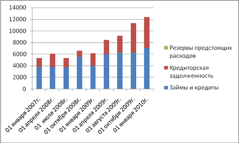 Рисунок 2.5 – Динамика пассивов На изменение структуры краткосрочных обязательств главное влияние оказал рост кредиторской задолженности на 231,52 % (что составило 3695 тыс. руб.). Доля краткосрочных обязательств в общей структуре пассива возросла с 5,11 % до 12,56 %. С одной стороны, данную тенденцию можно рассматривать как положительную, так как предприятие закупает сырье, следовательно, увеличивает объем продаж; с другой стороны – говорит о неплатежеспособности организации, т.е. не может вовремя оплатить предоставленный ему кредит. Кредиторская задолженность возросла, в основном, за счет роста задолженности перед поставщиками и подрядчиками, прирост составил 3152 тыс. руб. (494,82 %). Изменение доли в структуре пассивов – с 2,04 % до 9 %.