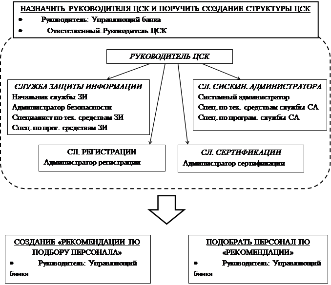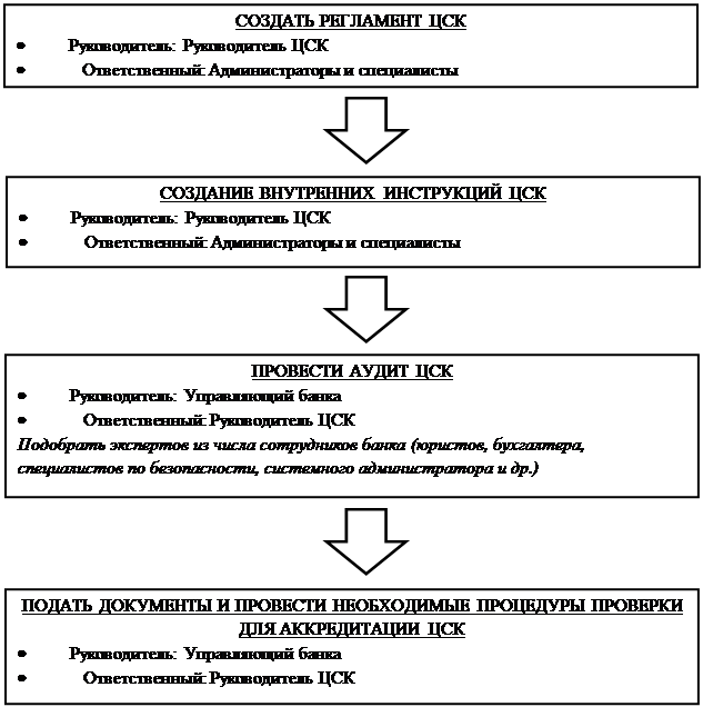 В третей частируководитель ЦСК и представители служб создают внутренние документы, проводятся проверки, и подаются документы на аккредитацию (Сх.3). Схема 2. Вторая часть этапа создания ЦСК