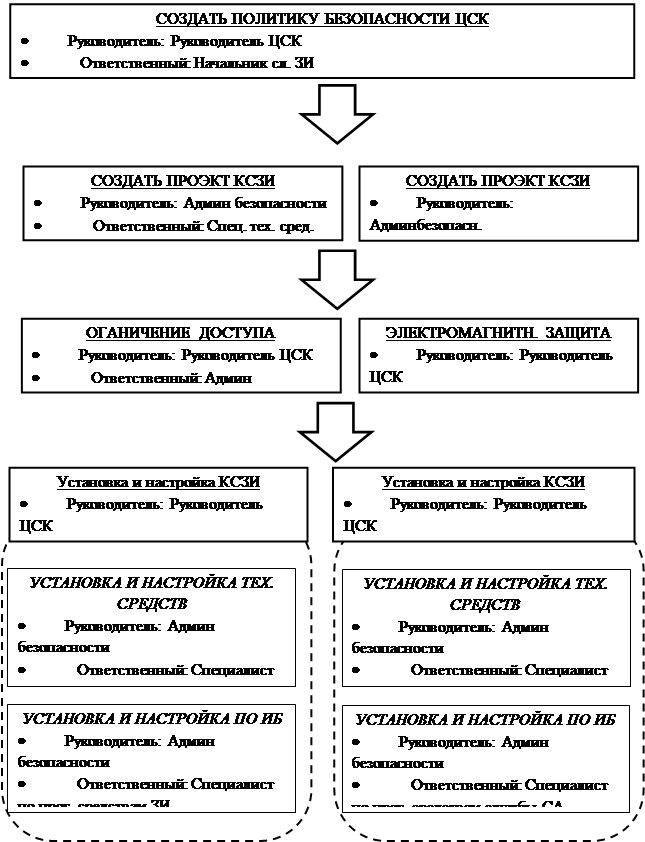 Вторая часть относиться к созданию политики безопасности на основе которой разрабатываютсяпроектыкомплексной системы защиты информации и программно-технического комплекса предоставления услуги. После устанавливаться все средства по проекту(сх.2). Схема 2. Вторая часть этапа создания ЦСК