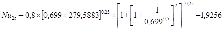 где Δ - эквивалентная абсолютная шероховатость внутренней поверхности трубопровода, для медных трубопроводов Δ = 1,5×10-6 м. Коэффициент теплоотдачи на наружной поверхности участка термической стабилизации рассчитывается как сумма двух составляющих: a2 t = aКТ +aЛТ = 10,352 + 2,1003 =12,4523 [Вт/м2 ·К], коэффициента теплоотдачи αкт учитывающего влияние конвективного теплообмена, и коэффициента теплоотдачи αлт учитывающего влияние теплообмена избиением: