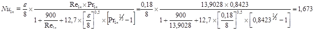где Δ - эквивалентная абсолютная шероховатость внутренней поверхности трубопровода, для медных трубопроводов Δ = 1,5×10-6 м. Коэффициент теплоотдачи на наружной поверхности участка термической стабилизации рассчитывается как сумма двух составляющих: коэффициента теплоотдачи αкп учитывающего влияние конвективного теплообмена, и коэффициента теплоотдачи αлп учитывающего влияние теплообмена избиением: α2п = αкп +αлп =7,1804+1,9643=9,1447Вт/м2 ·К