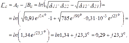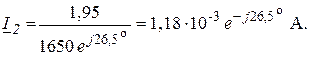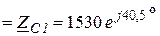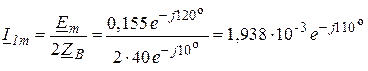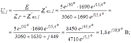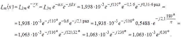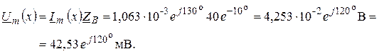 Здесь последнее значение угла получено после сложения с углом 360° (поворот вектора на 360° не изменил физическое значение угла, но позволил получить меньшее по модулю значение аргумента комплексного выражения тока). Комплексную амплитуду искомого напряжения находим по закону Ома для бегущей волны: