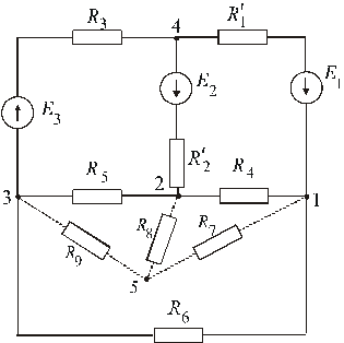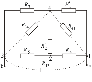 Второй пункт задания выполнен. III. Выполнение третьего пункта задания. Рассматриваемая схема замещения содержит четыре узла, поэтому к заданной схеме метод двух узлов непосредственно не применим. 1. Используя эквивалентное преобразование участка схемы