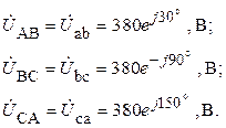 2. Определяем комплексы действующих значений линейных и фазных напряжений