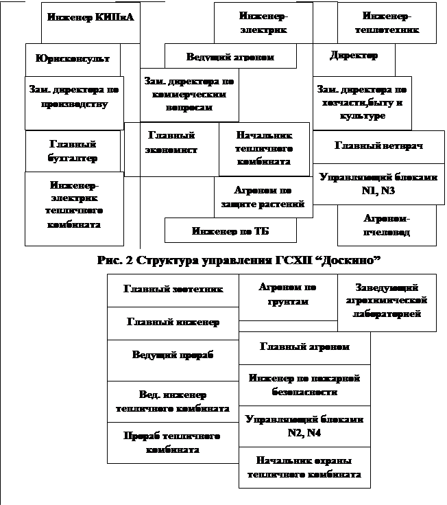 Организационная структура управления предприятием.ГСХП ”Доскино” имеет отраслевую структуру организации и управления. Все производство поделено на 8 цехов и служб строго по отраслевому признаку, причем тепличный комбинат выделен в отдельный цех, т.к. он является очень крупным и значимым подразделением. В состав цехов входят бригады в зависимости от рода выполняемых ими работ (Рис. 1). Общее руководство предприятием осуществляет директор, которому непосредственно подчиняются 4 заместителя и 5 специалистов, курирующих соответствующие производственные участки (Рис. 2).