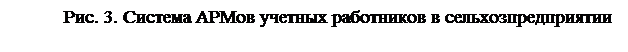 В простейшем случае комплексная механизация бухгалтерского учета может осуществляться при освоении и внедрении учета труда и его оплаты (ОПЛАТА) и ведения аналитического и синтетического учета (САУ). При этом обеспечивается ведение лицевых счетов работников хозяйства, ведение регистров аналитического учета по всем счетам бухгалтерского учета, получение оборотного баланса. АРМ главного бухгалтера принимает файл «Главная книга» позволяет Главному бухгалтеру составить отчеты в налоговые органы.. АРМ бухгалтера по учету основных средств (УОС ) расширяет возможности первых двух пакетов и позволяет осуществлять пообъектный учет основных средств, автоматизировать начисление и распределение амортизационных начислений и износа. АРМ бухгалтера по учету готовой продукции и ее реализации (УГПР) расширяет возможности системы в части оперативного получения данных о произведенной, отгруженной, оплаченной продукции, позволяет организовать выписку товарно-транспортных накладных и платежных поручений на отгруженную продукцию и может использоваться в с/х предприятиях с большими объемами документации по реализации продукции (овощемолочные, по производству мяса и мясопродуктов и др.). АРМ бухгалтера по учету материальных ценностей (УМЦ) существенно расширяет возможности САУ в части оперативного слежения за движением и использованием производственных запасов, позволяет автоматизировать выписку первичных документов, ведение учета отклонений и может применяться в с/х предприятиях с большими объемами документации по движению товарно - материальных ценностей. АРМ учетчика (диспетчера) по учету работы автотранспорта, машинно - тракторного парка позволяет механизировать обработку путевых листов автомобилей, тракторов, а также начисление оплаты труда работникам с/х предприятий, автоматизировать учет технико-эксплуатационных показателей работы автотранспорта и тракторного парка и может применяться для механизации и автоматизации оформления первичных документов по начислению оплаты труда в структурных подразделениях (автопарк, цех, отделение, бригада). АРМ кладовщика предназначен для механизации складского учета на складах с большой номенклатурой и движением товаров. АРМ касса позволяет организовать учет денежных средств и выписывать «платежные поручения», «платежные требования» и т. д. Конкретный состав системы АРМов определяется при обследовании с/х предприятий - при этом определяется состав используемых пакетов программ и их распределение по имеющимся персональным компьютерам и организации их в сети. Обмен учетной информацией между АРМами может производиться в виде машинных файлов (на дискетах, или по сети) или совместного использования БАЗ ДАННЫХ в сети. Рассмотрим файловый способ обмена учетной информацией между АРМами. Предусмотрены следующие пути обмена данными в виде машинных файлов (на дискетах): · от АРМ учетчика (диспетчера) в АРМ бухгалтера по оплате труда - данные о начисленной оплате труда в виде файла FZ1001 для их включения в лицевые счета работающих; · от АРМ учетчика (диспетчера) в АРМ бухгалтера по учету основных средств - данные о пробеге автотранспорта в виде файла mesprob для начисления амортизационных отчислений; · от АРМ кладовщика в АРМ бухгалтера по учету материальных ценностей - данные о движен